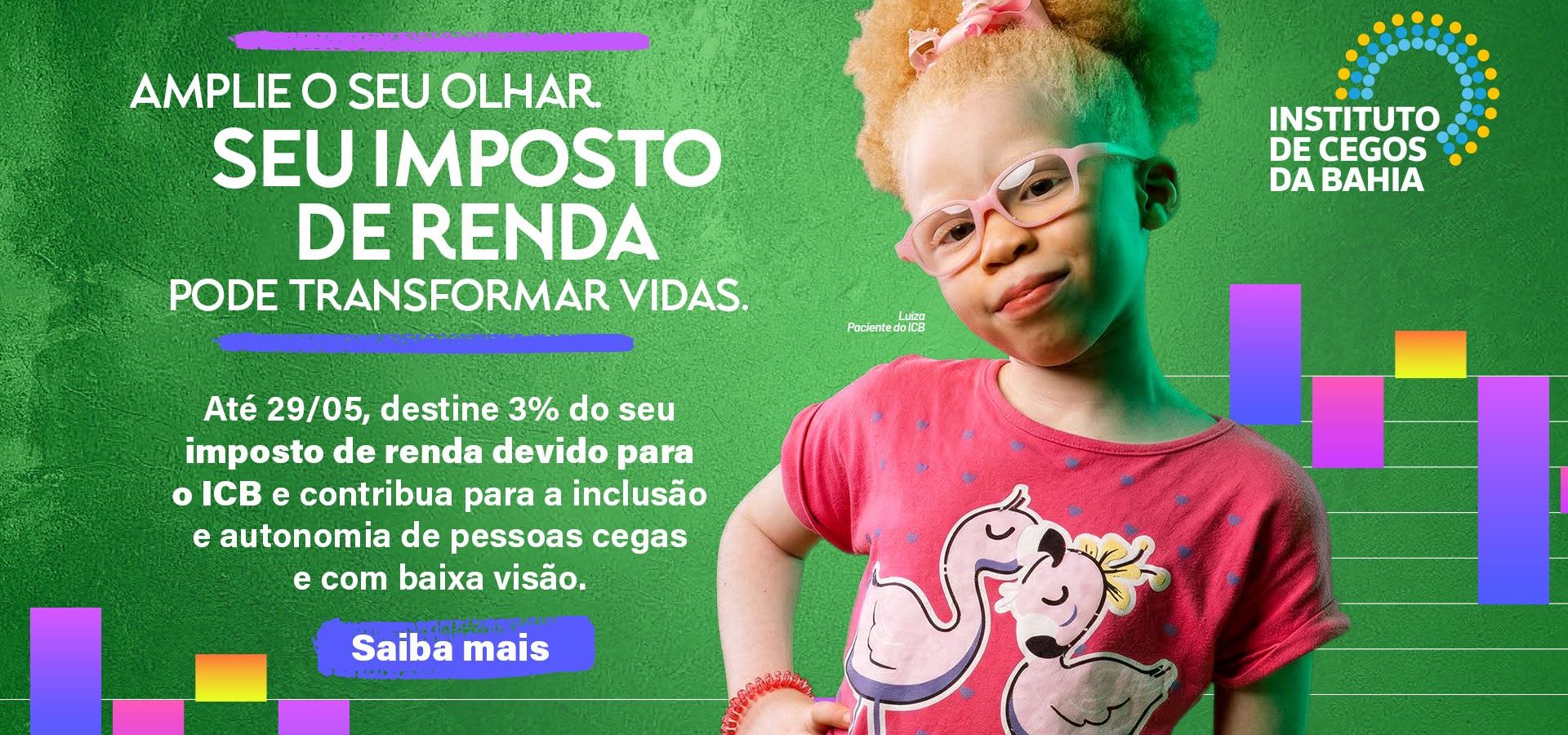 Desde 1933, o Instituto de Cegos da Bahia atua nas áreas de saúde, educação e assistência social. No ICB é realizado um trabalho de prevenção e diagnóstico da cegueira/baixa visão, habilitação/reabilitação e inclusão social de crianças, jovens, adultos e idosos, de maneira gratuita, em todo o estado da Bahia e demais estados do Brasil.